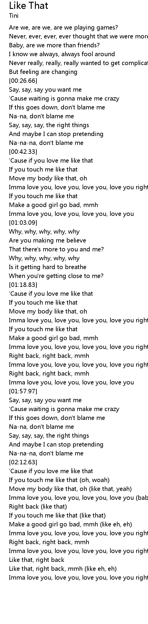 Baby baby baby when you touch me like this. If I kiss you like this And if you whisper like that It was lost long ago But its all coming back to me If you want. I dont remember feeling like this Baby Baby I love you Baby Baby I love you I got this jones forming in my bones From a man Who indeed took over my soul. To Love You More 18.