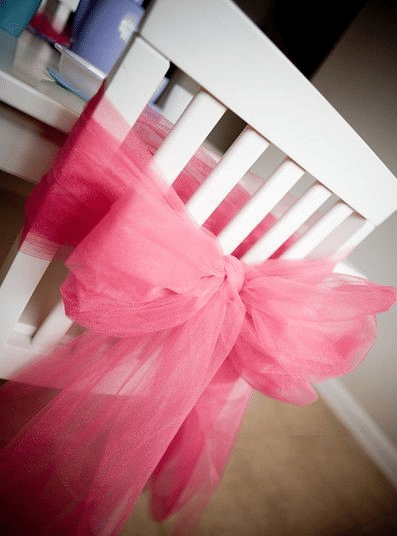 Decorate baby shower chair using Fabric. To keep the fabric in place wrap a wide strip of tulle around the chair back and tie it in a bow. Smells are very enticing.