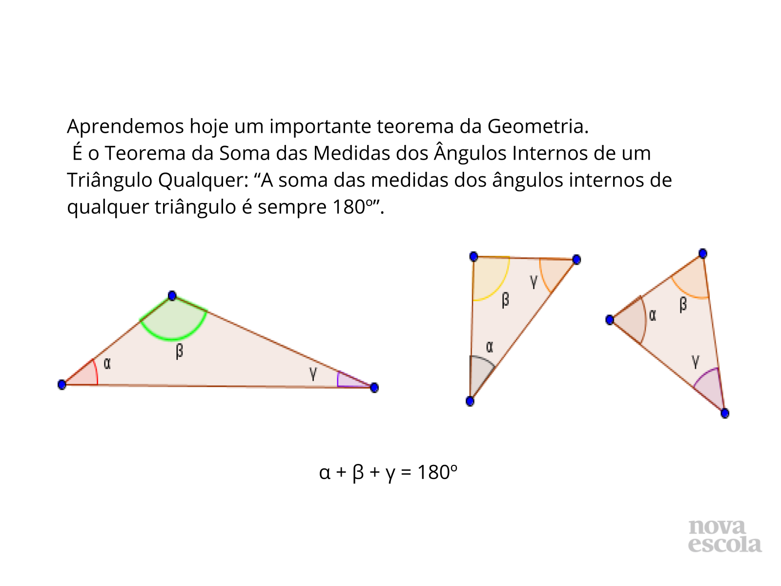 Se os ângulos têm a mesma medida - 60 graus - trata-se. 60 60 X 180. Os triângulos possuem uma propriedade particular muito interessante relativa à soma de seus ângulos internos.